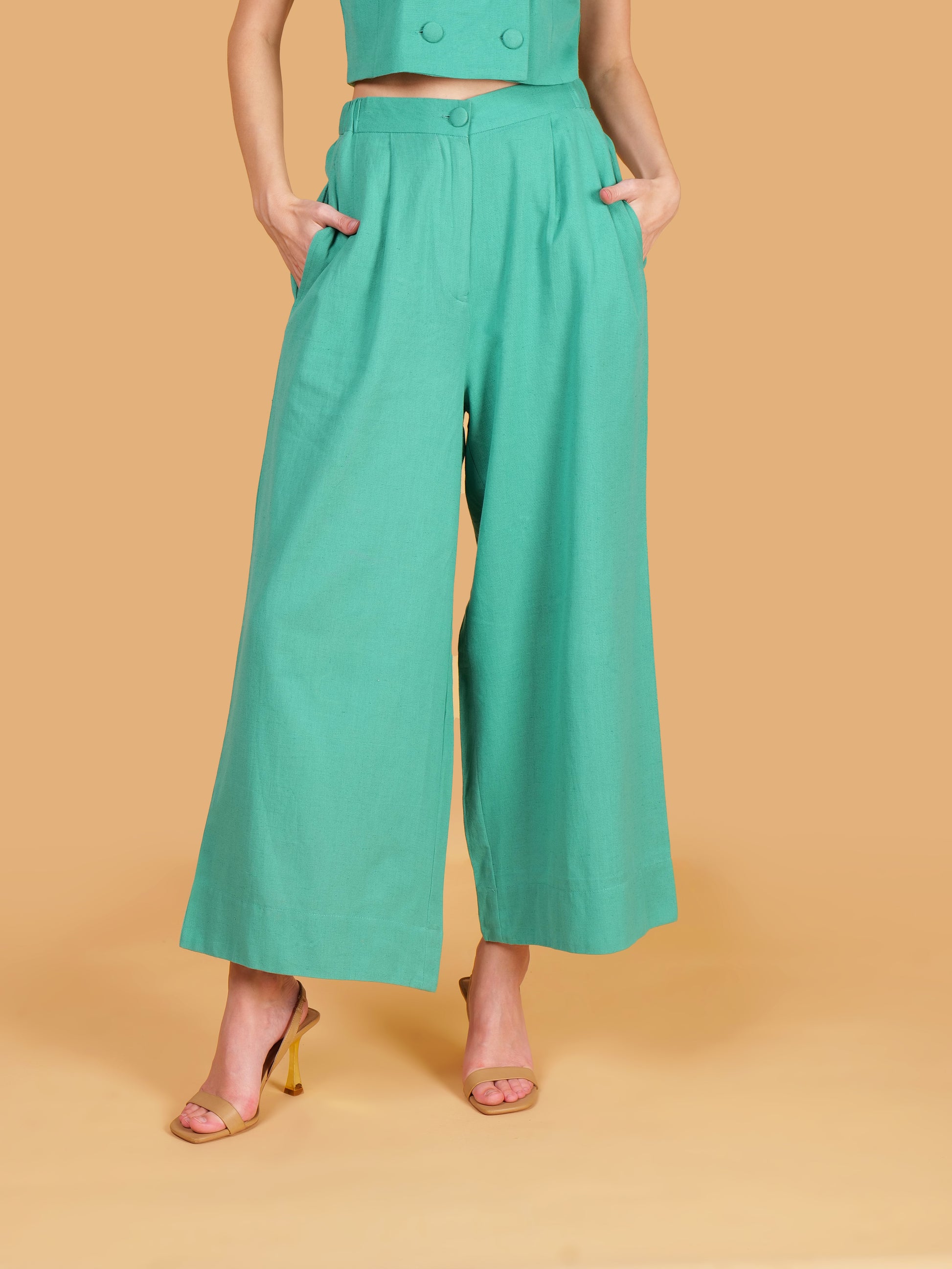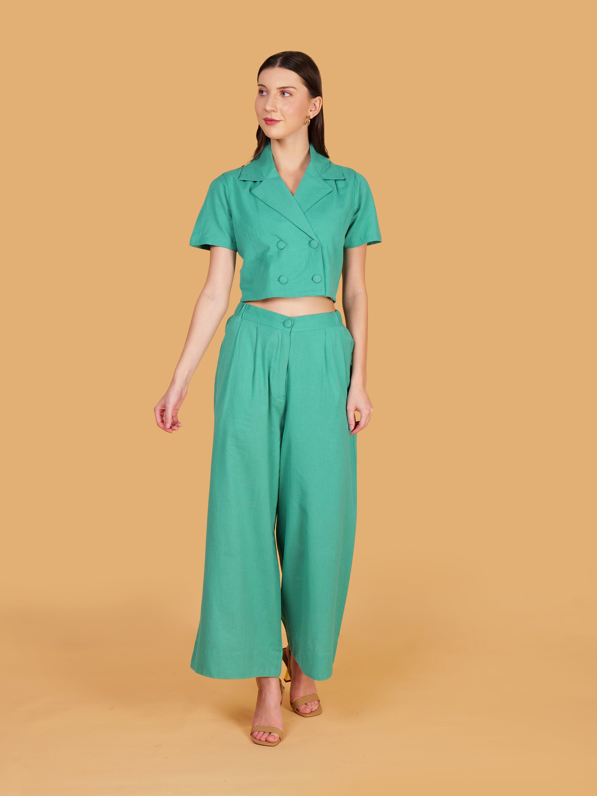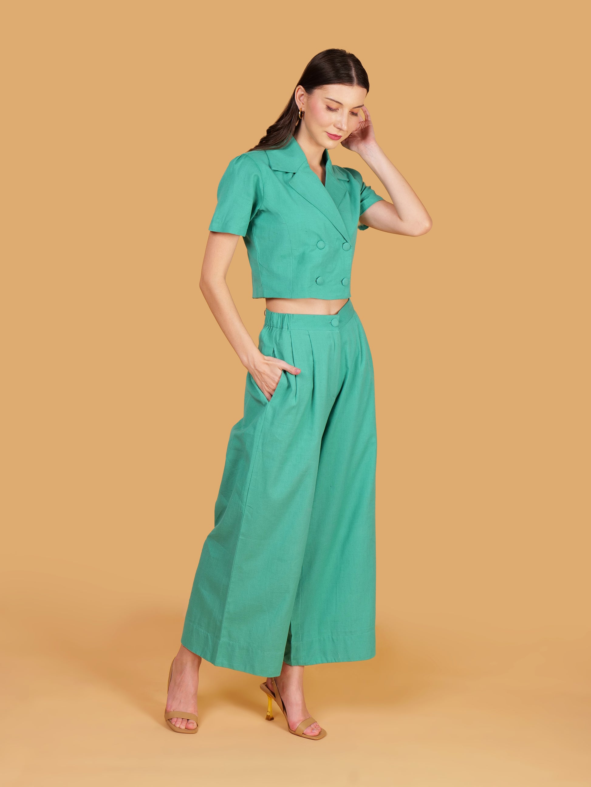 Aqua Blue Cotton Double Breasted Notched Lapel Crop Top Coord Set