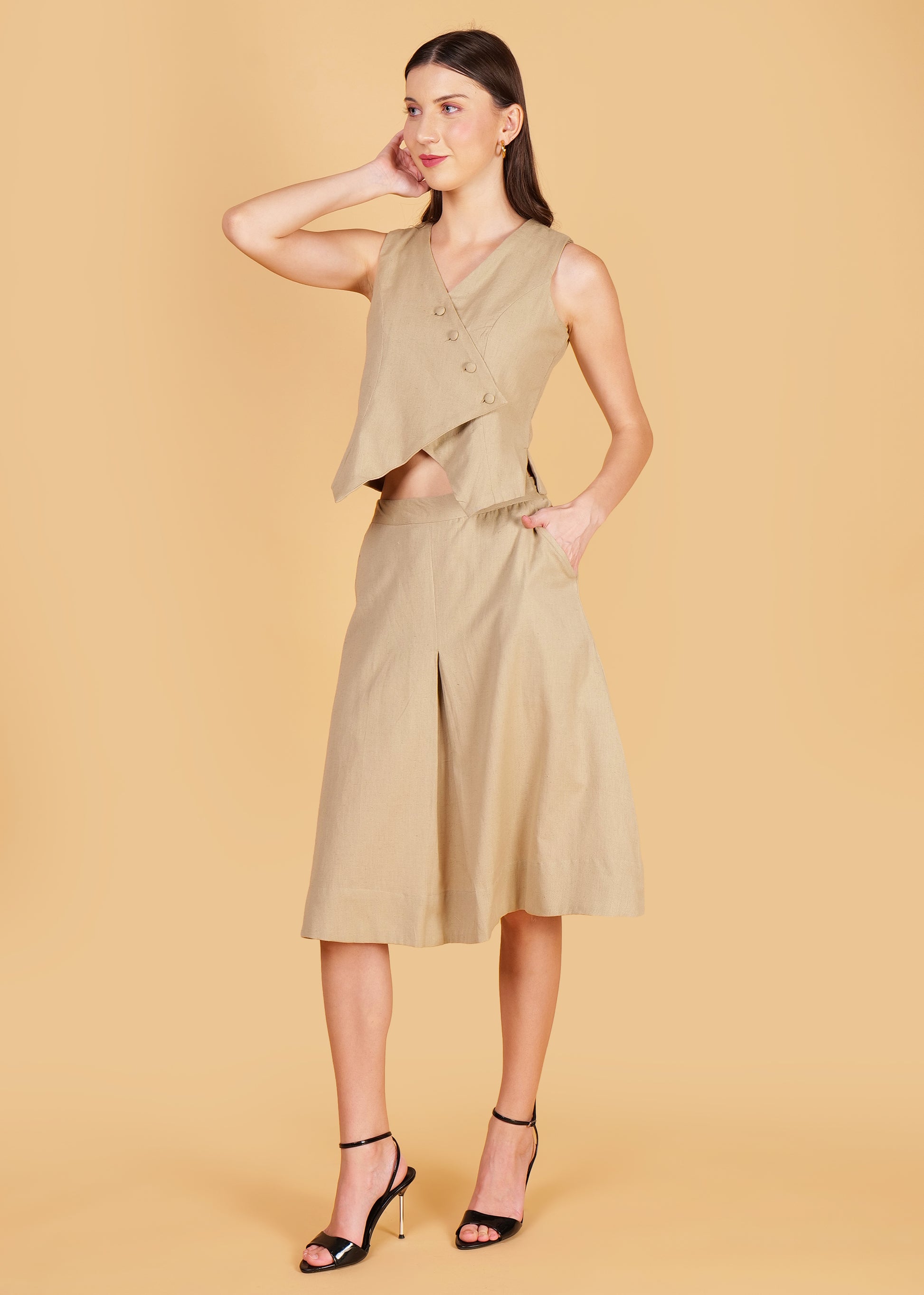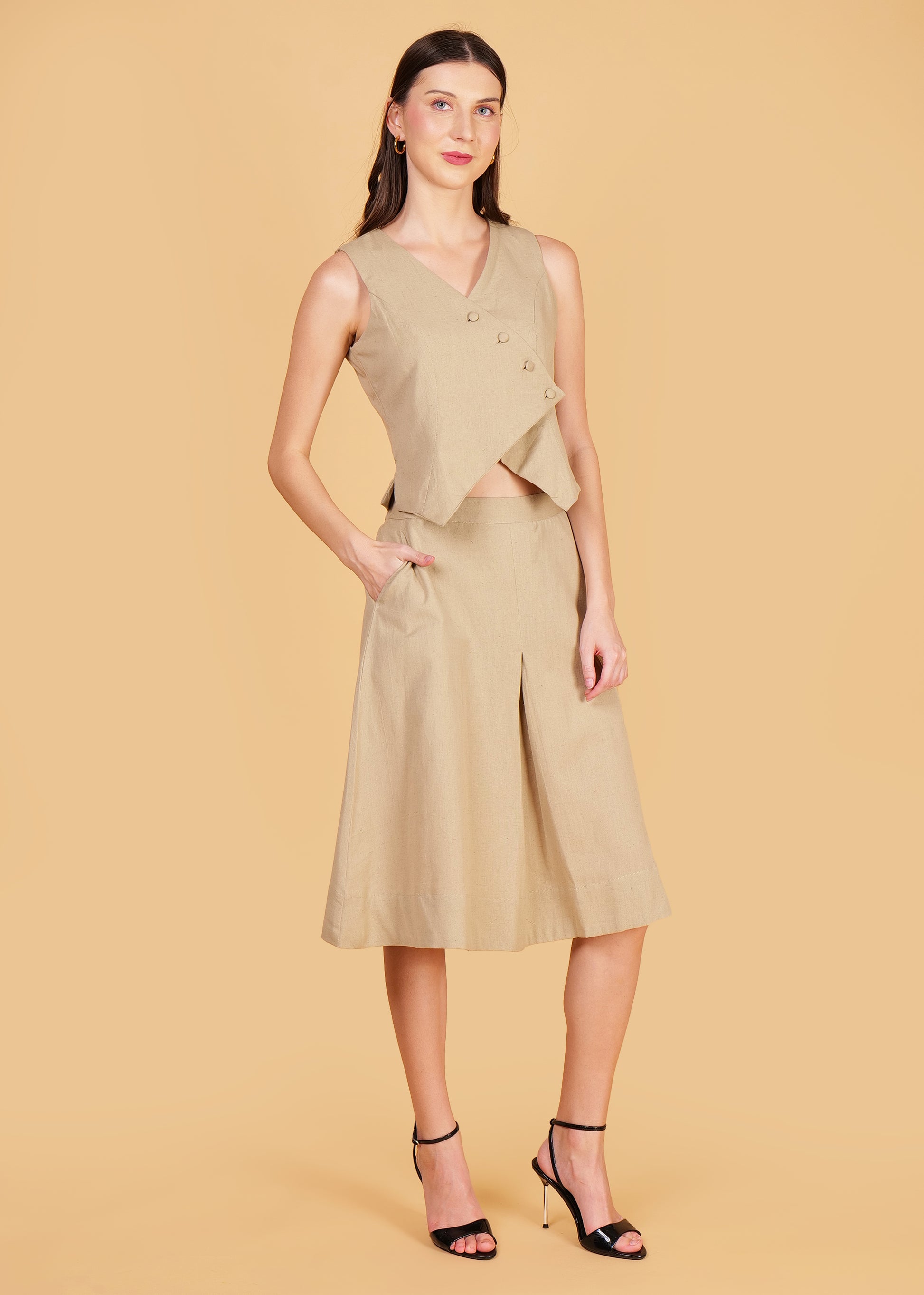 Beige Cotton Front Overlap Waist Coat & Skirt Coord Set