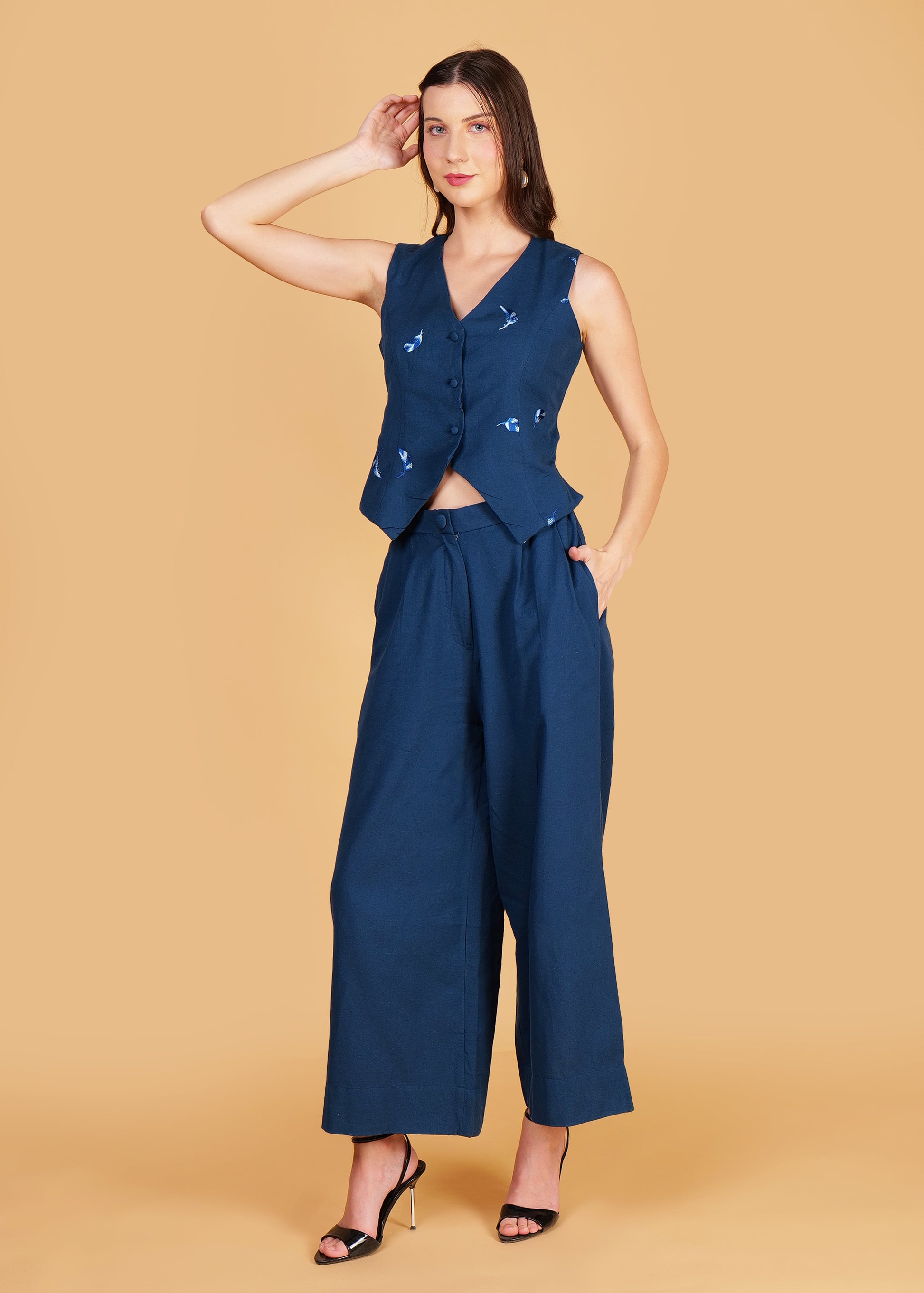 Blue Cotton Front Overlap Waist Coat & Pant Coord Set