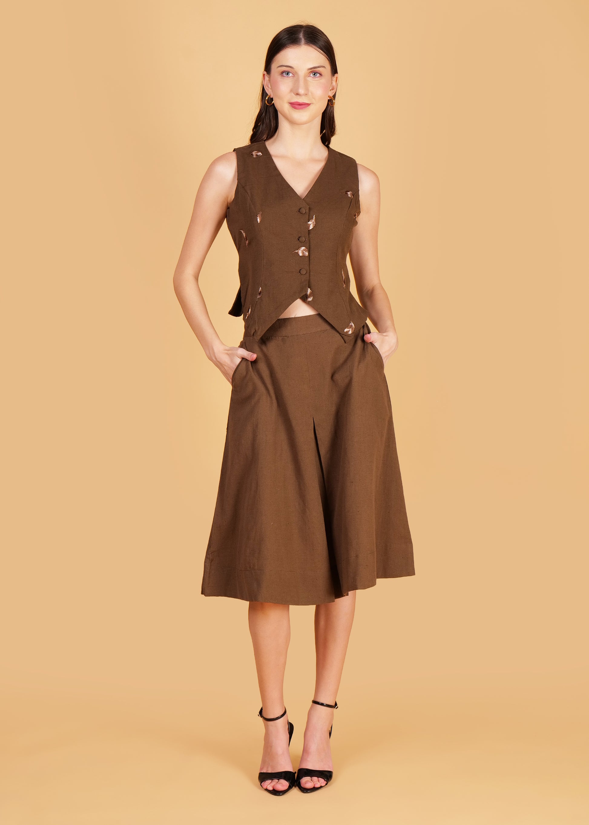 Brown Cotton Embroidered Waist Coat & Skirt Coord Set