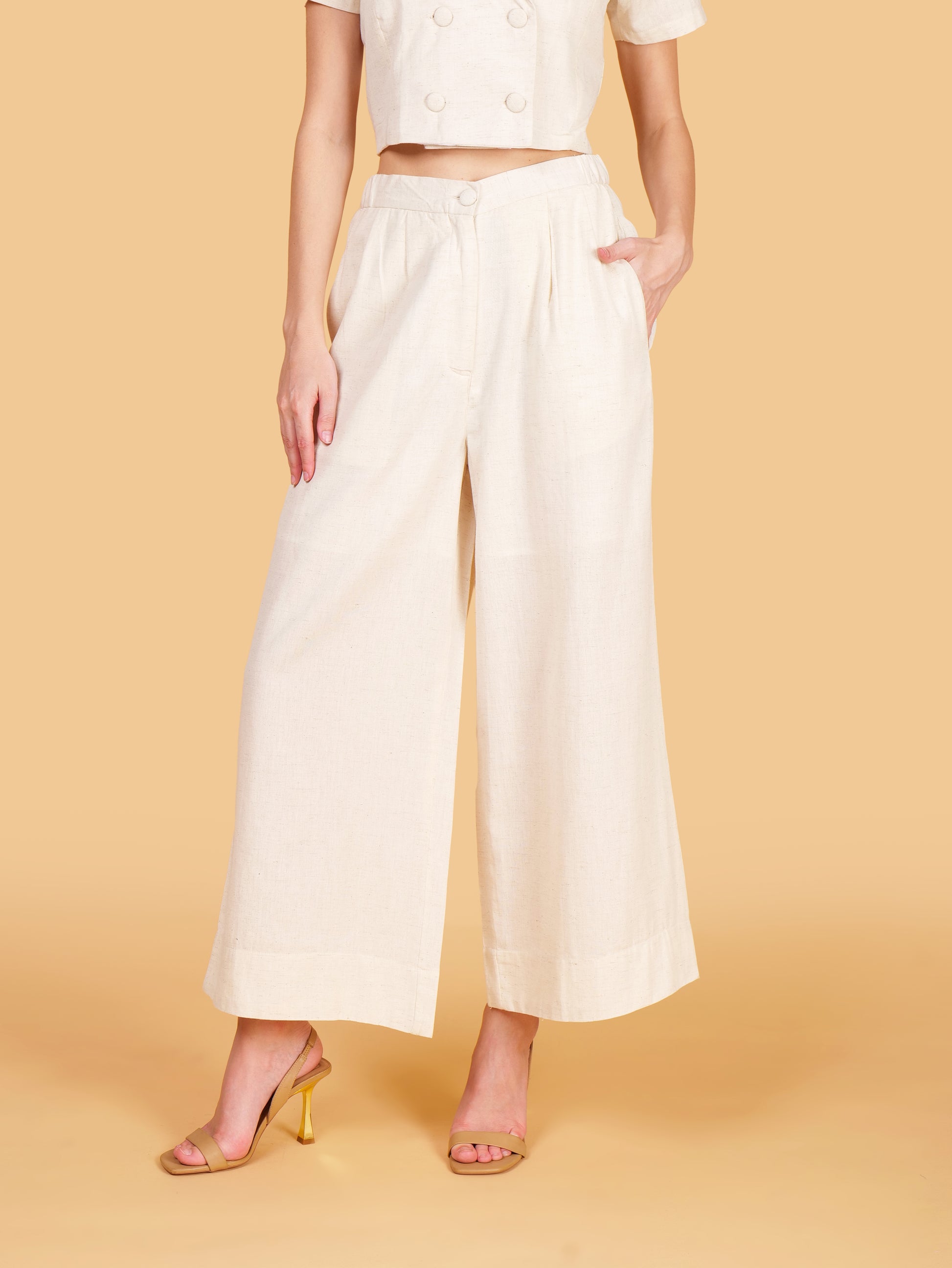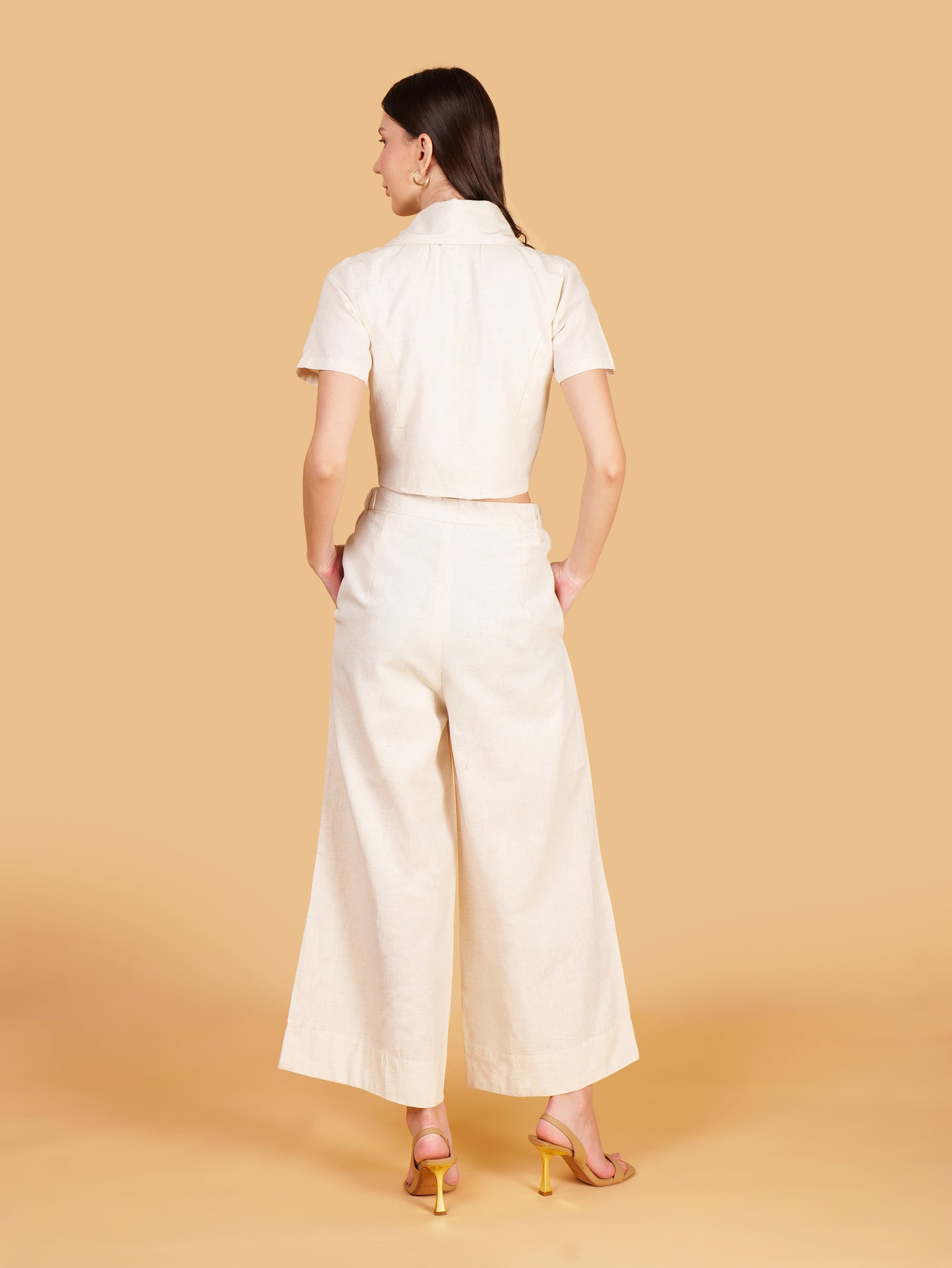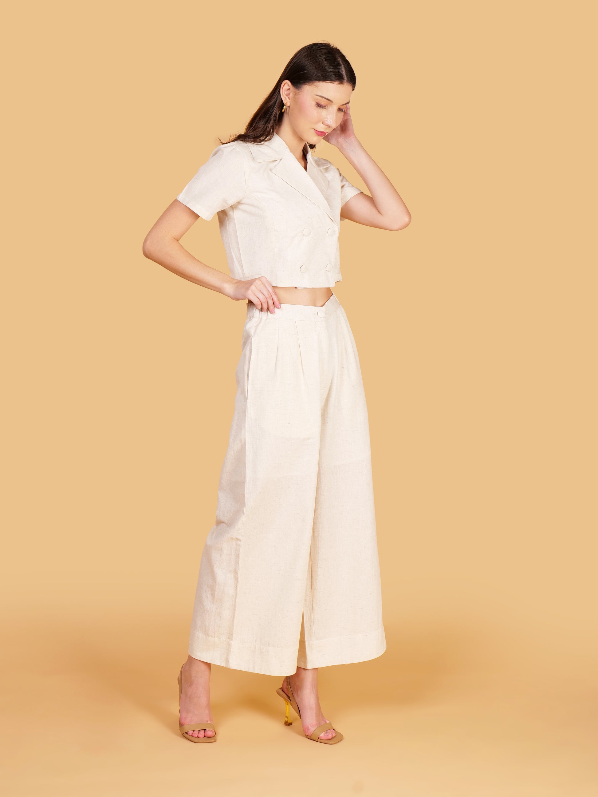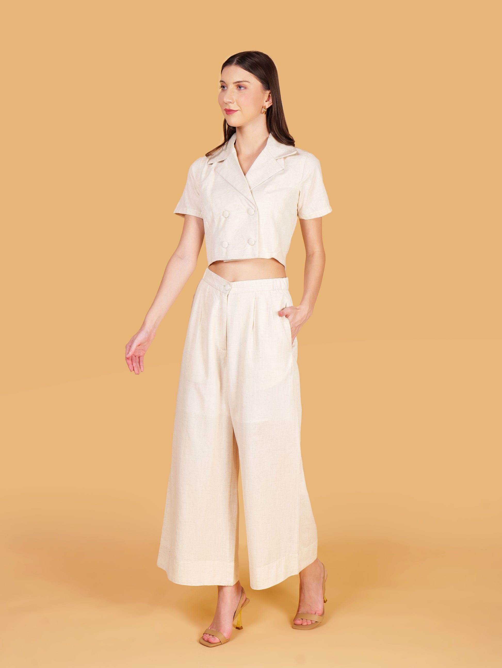 Off White Cotton Double Breasted Notched Lapel Crop Top Coord Set