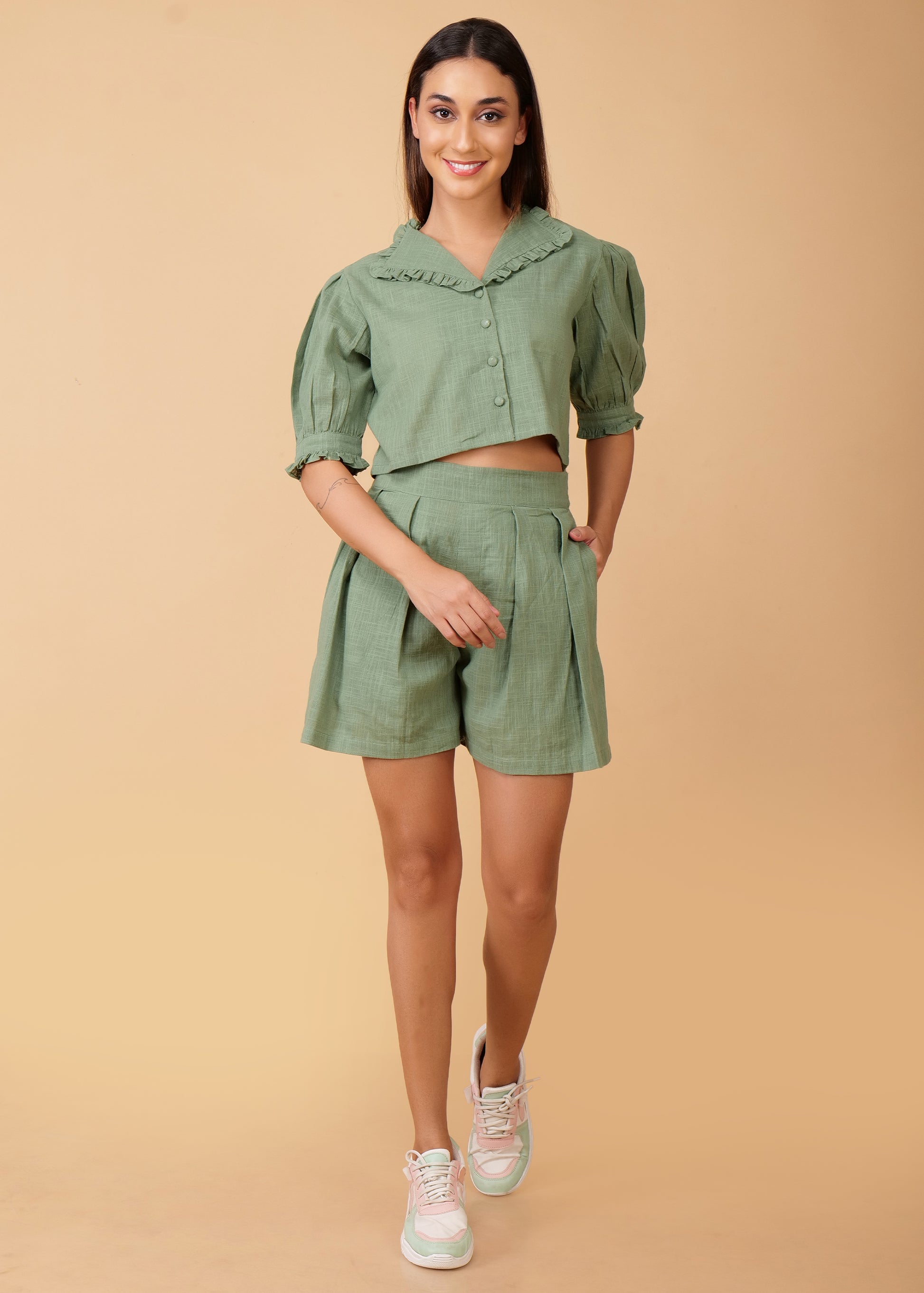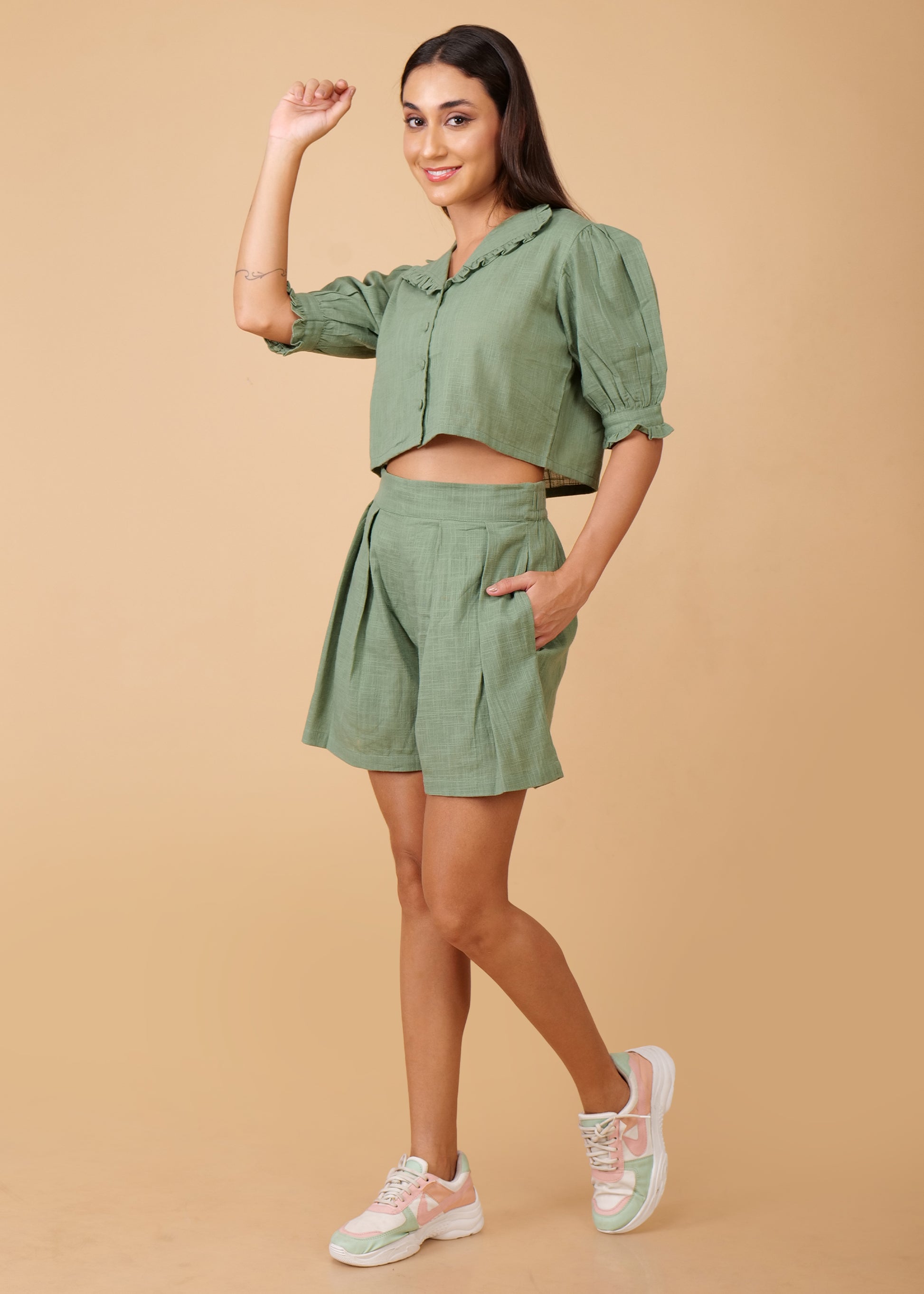 Aqua Blue Cotton Double Breasted Notched Lapel Crop Top Coord Set