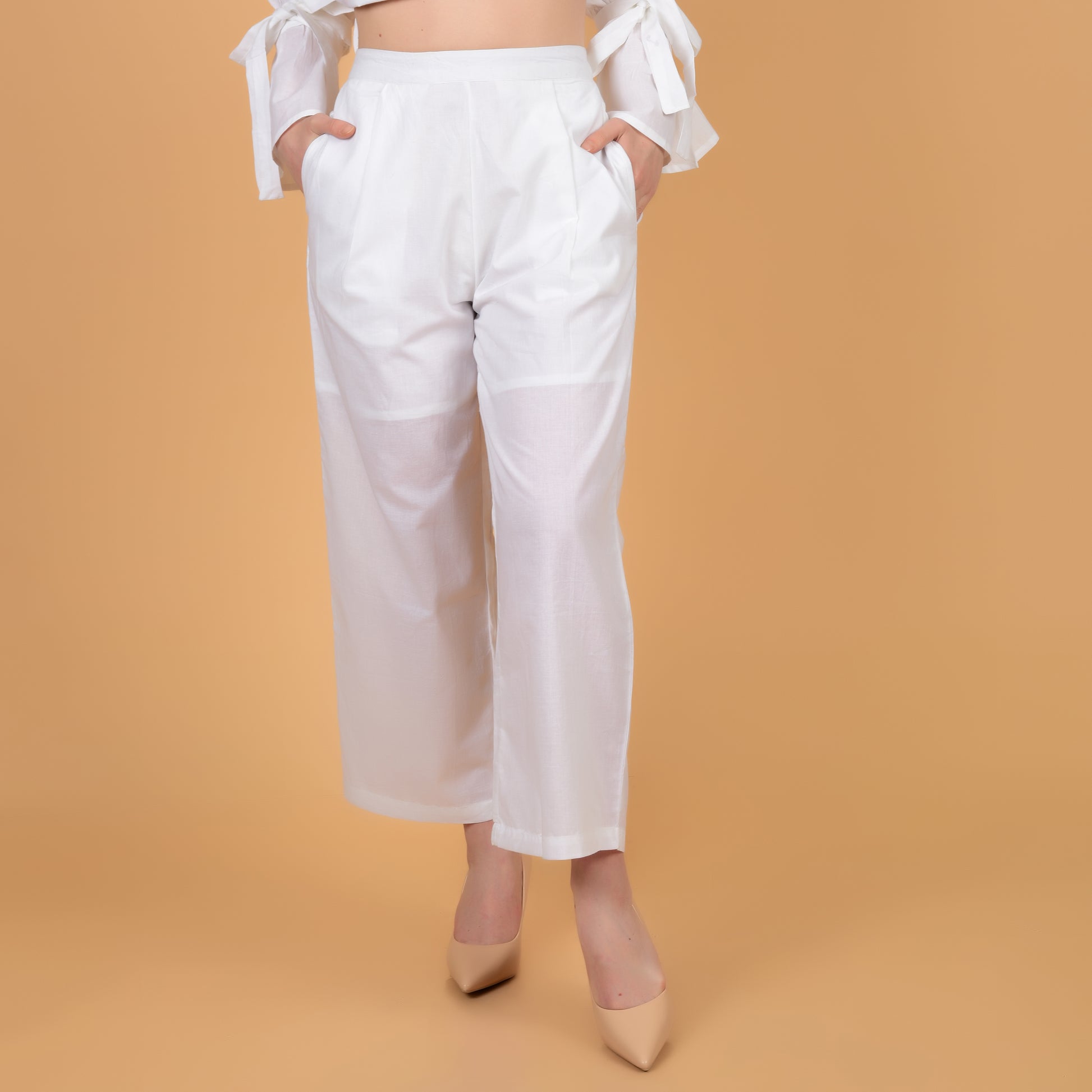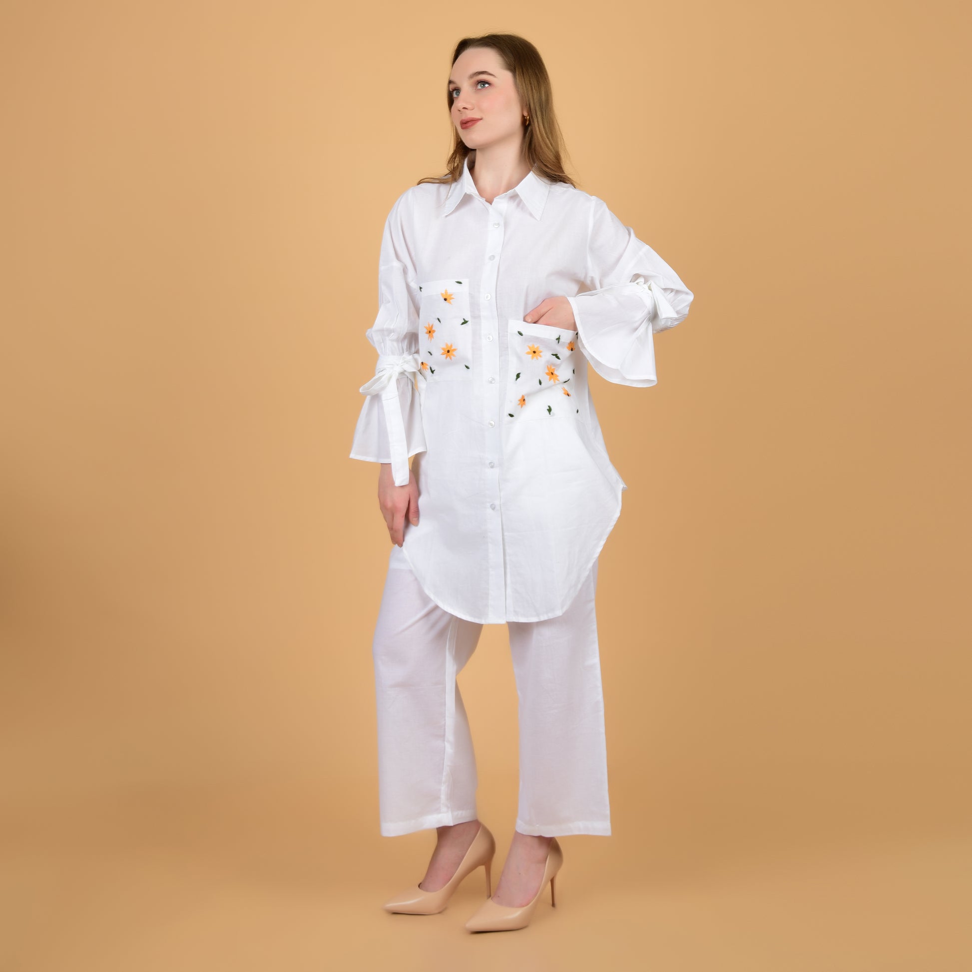 White Pure Cotton Long Shirt With Hand Embroidered Pocket and Frilled Sleeves Coord Set