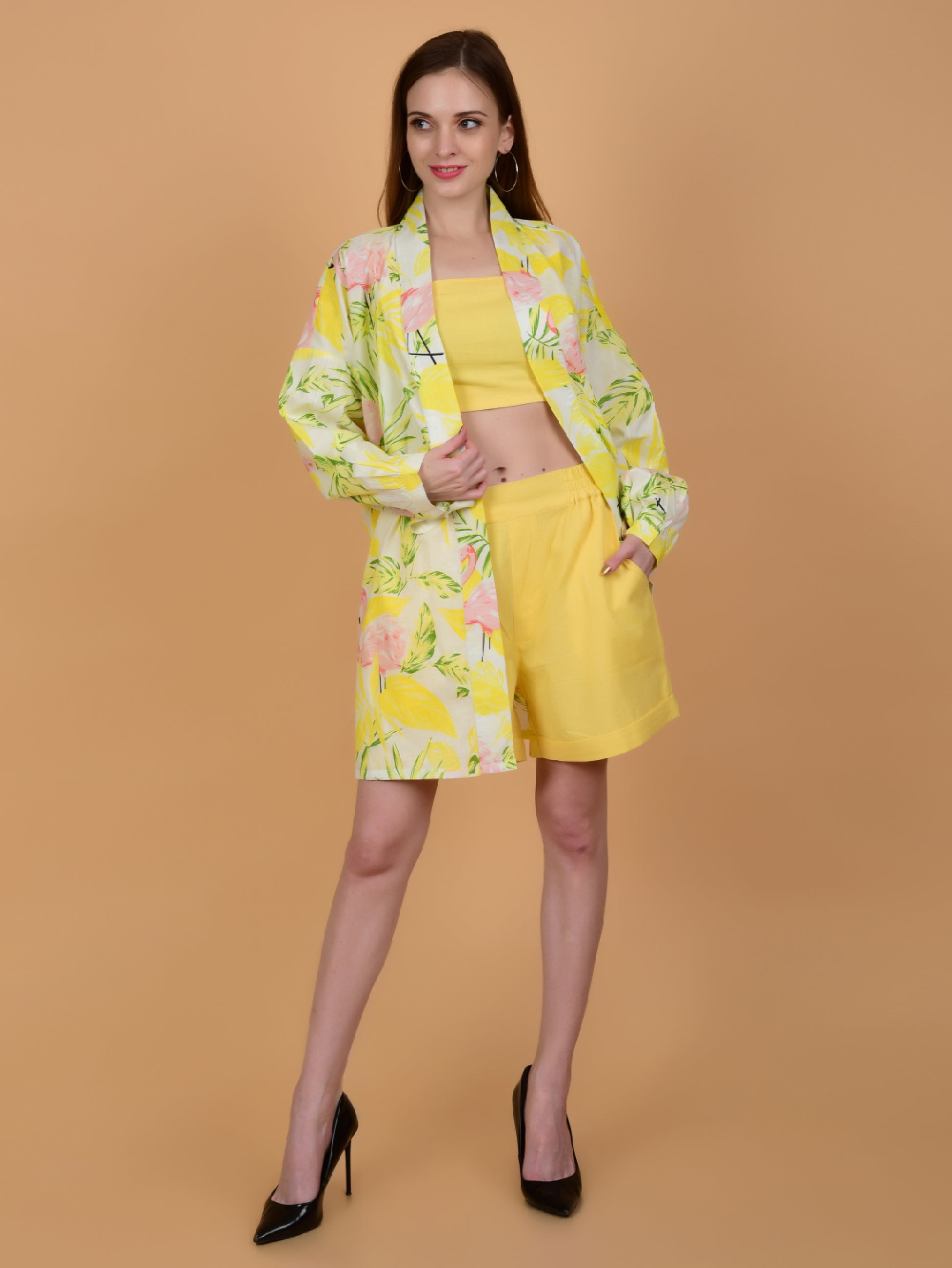 Yellow Flamingo Print Pure Cotton Shrug